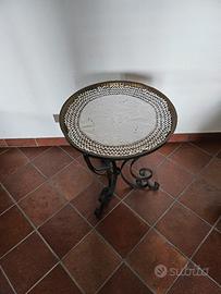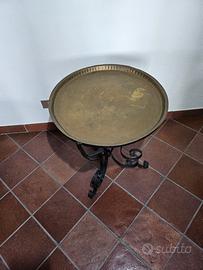 Tavolino base ferro battuto, piatto in ottone. Diametro piatto cm 55 Altezza cm 67