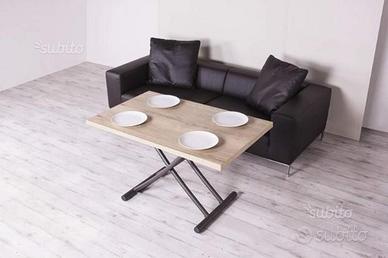 Tavolino trasformabile in tavolo da pranzo, base in metallo, meccanismo a gas regolabile in altezza al millimetro da cm 11 a cm 75,5, piano in nobilitato, legno o effetto malta. Ruote a scomparsa e rotelle trasversali.