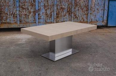 Tavolo da pranzo allungabile, base centrale in metallo, piano in nobilitato, legno o effetto-malta, 6 prolunghe interne, gambe pieghevoli di supporto.