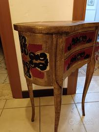 Comodino / tavolino in stile veneziano con due cassetti e gambe mosse, finemente dipinto e dorato.