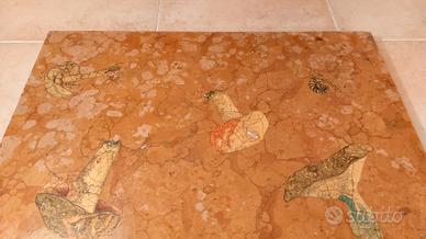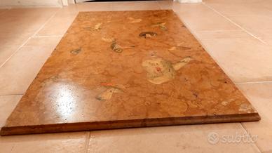 Piano in massiccia lastra di Marmo Rosso Verona naturale, con decorazione a motivo micologico, in stampa transfer sotto resina verificata trasparente.