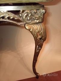 Vendo elegante tavolino da salotto originale degli anni '60/'70, in pieno stile Barocco/Hollywood Regency. Un pezzo di antiquariato moderno di grande impatto visivo. Piano: Pregiato onice verde naturale con spettacolari venature ruggine e crema. Bordo sagomato a serpentina. Base: Struttura in ottone (o bronzo) riccamente lavorata con motivi floreali e fregi a conchiglia. Gambe mosse (cabriole) eleganti e stabili. Stato: Ottime condizioni vintage. Il piano è integro e ben lucidato. Dimensioni: 79 x 50 x 46] Ideale per: Soggiorni classici, studi professionali o come pezzo di contrasto in arredamenti moderni/eclettici. Ritiro a mano