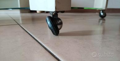 Tavolino vintage design tipico anni 70 in legno bianco panna con ruote piroettanti. Ha tre ripiani in vetro amovibili, quello sopra è fumè, uno dei due inferiori è leggermente scheggiato (vedi dettaglio in foto). Segni del tempo sui profili ma è bello così. Misure 48x53 x 50 di altezza.
