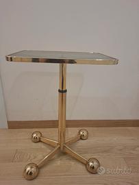 Tavolino vintage Arredamenti Allegri (Parma) in ottone lucido e piano in vetro fumé, originale d’epoca. Design iconico con base a 4 bracci terminanti con sfere e struttura interamente in metallo dorato.