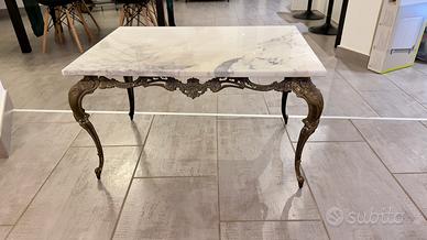 Splendido tavolino da salotto o da ingresso, caratterizzato da un forte richiamo allo stile Barocco/Rococò (o Luigi XV). La base è realizzata in metallo fuso (simile a ottone o bronzo patinato), riccamente lavorata con dettagli floreali e volute decorative.
