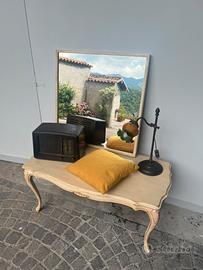 Elegante Tavolino vintage in stile francese Luigi XV, restaurato a mano con finitura shabby chic color avorio caldo e legno naturale in evidenza su rilievi e nodi comlleta dí specchio abbinato