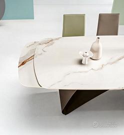Tavolo allungabile in pietra sinterizzata effetto marmo con due allunghe da 40 cm, base in metallo verniciato.
