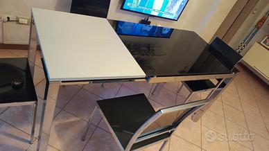 Vendesi tavolo con piano in vetro nero lucido misure 110x70 cm da chiuso aperto 170x 70 cm. la struttura è in acciaio lucido e le 4 sedie abbinate sempre nere con struttura in acciaio lucida completano il set. Ha una misura molto comoda quando non si ha molto spazio in soggiorno o in altri locali particolarmente stretti ma adattabile in qualsiasi ambiente, elegante e comodo da pulire con un panno.