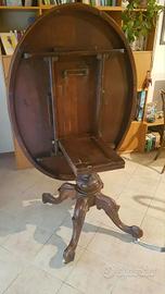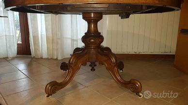 Vendesi tavolo ovale Inglese a vela del 1800 con il pianale in radica di Noce, completo di quattro sedie cabriolet originali.