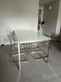 tavolo in acciaio cromato con piano vetro temprato più 4 con gambe in acciaio cromato e sedile in policarbonato trasparente misure 180cm x 85 cm