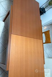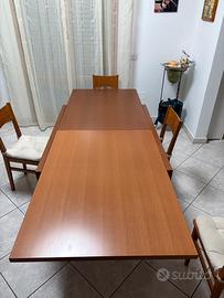 Tavolo cm 120X92Xh75 allungabile a cm240 completo di 4 sedie il tutto di colore ciliegio, in buone condizioni, la differenza di colore visibile nella foto tavolo allungato e’ dovuta al poco utilizzo della parte allungabile mantenendo cosi il colore originale..