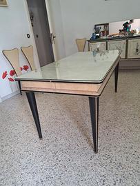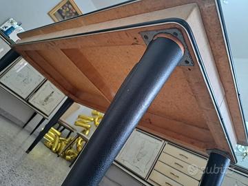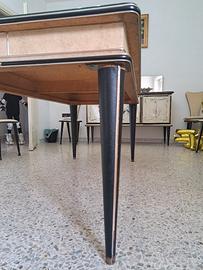 Tavolo realizzato dal designer italiano Umberto Mascagni nei primi anni '50, raro esempio dello stile e dell'eleganza tipica del periodo. La struttura è in legno, rifinita con vinile e bordature in alluminio anodizzato, elementi distintivi delle sue creazioni. I mobili firmati Mascagni venivano distribuiti negli anni '50 dal celebre department store Harrods di Londra, a testimonianza del loro prestigio internazionale. Il tavolo si presenta in ottime condizioni vintage, conservando intatto il fascino originale.
