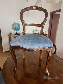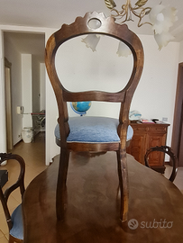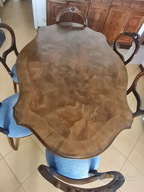 Vendo per cambio arredameno Tavolo antico + 6 sedie in noce perfettamente restaurato ,sedie con imbottitura nuova . Il piano è in radica di noce con intarsi Due sedie necessitano di essere incollate