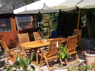 L'arredamento è realizzato in legno eucalyptus resistente agli agenti atmosferici.