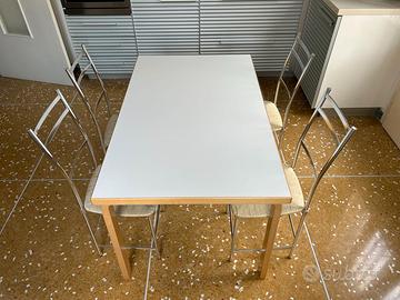 Il tavolo da pranzo unisce una struttura in legno di betulla massello mentre la superficie del piano è in laminato.