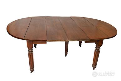 Tavolo inglese a bandelle con due prolunghe del tardo periodo Vittoriano. Si allunga a strappo. Presenti evidenti segni del tempo trascorso ma il tavolo ha solo bisogno di un piccolo restauro conservativo. Misure (LxPxH) 126 x 69-145 x 75