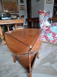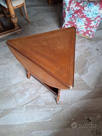 Il tavolo ha una base fissa di forma triangolare con un ripiano inferiore coordinato. Il piano superiore è composto da tre ali (bandelle) ribaltabili che, una volta sollevate, trasformano il tavolino da triangolare arotondo. Design è tipico dello stileEdoardianoo del tardo periodoVittoriano(fine '800 - inizio '900) NO SPEDIZIONE, SOLO RITIRO A DOMICILIO (ROMA SUD - Fonte Meravigliosa)