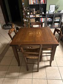 Vendo tavolo quadrato apribile a libro con 4 sedie buono,ma con segni di usura. Misure chiuso 1 metro x 1 metro, aperto 1 metro per 2