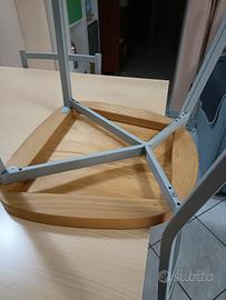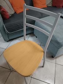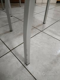 vendo tavolo a libro di legno con struttura in ferro completo di quattro sedie. Le misure del tavolo sono 90 x 90 chiuso, Aperto 90 x 180. Una gamba del tavolo e una sedia hanno una leggera graffiatura nel telaio