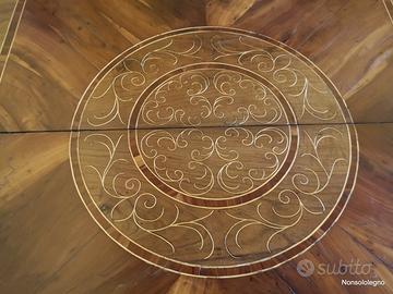 L’apertura a libro rivela l’importante lavoro di tarsia, con cornici concentriche e motivi decorativi disposti simmetricamente. Gamba troncopiramidale strozzata in ciliegio, lastronata e filettata, terminante in appoggio su vasetto.