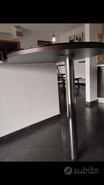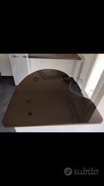 Tavolo a penisola a forma di pianoforte con gamba di metallo e top di cristallo.