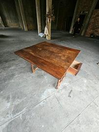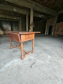 Elegante scrittoio antico in legno di castagno massello, con due alette laterali ribaltabili e due cassetti frontali.