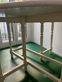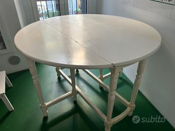 Tavolo rotondo bianco a due ribalte richiudibili diametro 118 e altezza 77, quando le due ribalte sono chiuse la misura è di 50 cm di ingombro