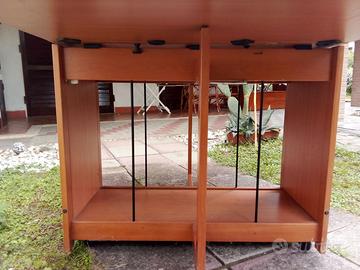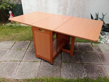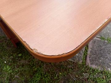 Tavolo a ribalta – marca Foppapedretti modello Copernico – materiale: legno con rivestimento laminato - colore marron – dimensioni 46/108/159 X 90 cm (chiuso/aperto solo un lato/aperto tutto) altezza 74 cm – usato, in condizioni discrete (il rivestimento è leggermente sollevato in alcuni punti del bordo del piano di appoggio superiore ed è leggermente sbiadito nel centro, angoli usurati come da foto)