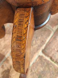 Elementi geometrici riquadrano il motivo centrale a cui si aggiungono bordature stilizzate, classico il piede tornito ed intarsiato a coppe rovesciate caratteristico del periodo eclettico e testimonianza dell’abilità degli ebanisti rolesi.