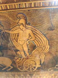 Riproduce un disegno molto particolare e raro nella tarsia rolese più curata “Il Carro di Marte”, graffito minuzioso e di particolare pregio, con ordine di intarsio fine e preciso.