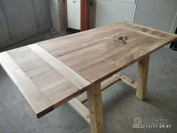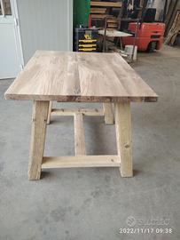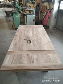 tavolo costruito in legno vecchio recuperato da solai o parancole da muratore leggermente levigate in modo che siano morbide al tatto mantenendo la pattina originale naturale per la scocca mentre per il top e allunghe in rovere rustico con qualche crepo e spaccatura. misura lunghezza 120 larghezza 90 altezza 80 con le 4 gambe costruite con pattina in tutti i lati da circa 8 x 8 unite tra loro con traverso sottostante proporzionato di congiungimento tra unione delle 2 gambe dx e sx, fissato con traverso nascosto e fissato sotto al piano con spessore finito circa 3 cm, nella parte centrale (prevediamo) spazio per 1 cassetti indipendenti che scorreranno su guide in legno e nascosto tutta (la scatola) e fissata direttamente sotto al piano. Le 2 allunghe 1 a dx e 1 a sx con misura lungh. 40 cm circa con 2 supporti a baionetta a T inseriti alle estremità essendo ben largo, le gambe saranno inclinate solo da un lato verso il (centro di loro stesse) le allunghe in rovere massello con venature sul lato del 40 con applicato alle estremità legno trasversale in modo da mantenerle dritte e non flessibili, unione delle tavole con anima interna nascosta. Sotto al piano incassati ferri a T in modo che non si incurvi nel tempo. Il tavolo sarà smontabile. Tappi in gomma parte sotto per non rovinare il pavimento. Finitura sbiancata sulla scocca telaio in abete vecchio mentre per il top in rovere effetto grezzo naturale trasparente. Con questo prodotto non altera il colore e lo protegge da acqua o altro. costruito su commissione ed esigenze del cliente, non è disponibile a magazzino ma essendo i diretti produttori falegnami possiamo riprodurlo uguale o in base alle proprie esigenze. per domande o dubbi contattateci P.S. disponibili a dare suggerimenti o chiarimenti in merito, per noi conta dare vita al vostro sogno DIRETTAMENTE DAL PRODUTTORE ASTENERSI RIVENDITORI O COMMERCIANTI