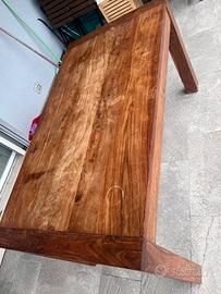 Vendo tavolo di acacia, misure 150x80x80h. Completo di due prolunghe di 40cm cad (una per lato). Qualche segno di utilizzo ma ben tenuto. Nella foto é all’esterno ma é sempre rimasto in casa. Ritro a carico acquirente.