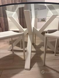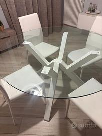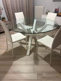 Vendo tavolo rotondo in vetro con gambe bianche diametro 140cm + 4 sedie bianche con schienale alto.