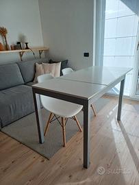 Tavolo estensibile da 110 a 150 cm, largo 70 cm. Struttura molto stabile con gambe grigie e piano bianco. Buone condizioni generali, solo scheggiatura su uno spigolo visibile in foto.