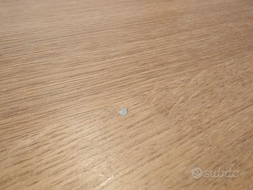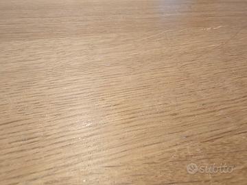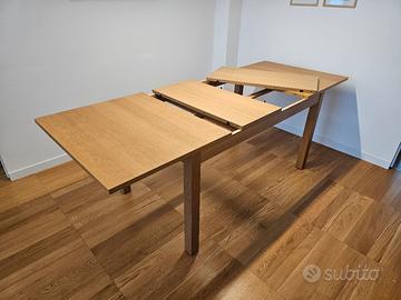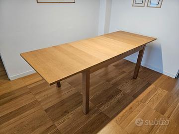 tavolo allungabile ikea bjursta in legno rovere, misure 140/180/220 x 85. presenta segni di usura su gambe e piano principale: da ripristinare la verniciatura trasparente superficiale e un piccolo foro. consegnato smontato, con tutti i pezzi e istruzioni.