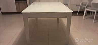Tavolo da cucina con piano in vetro bianco e struttura in robusto metallo bianco. Si allunga fino a 380 cm comodamente con 4 prolunghe da cm.60.