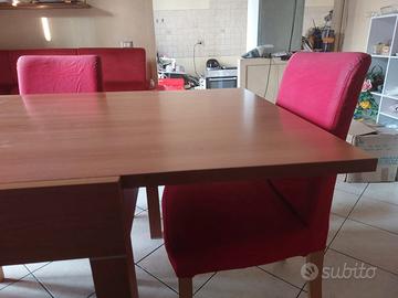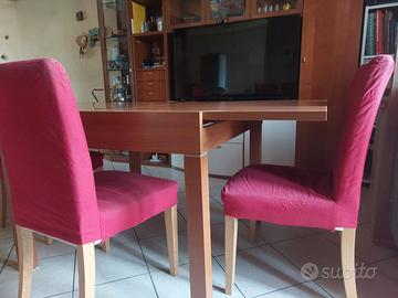 Tavolo in legno quadrato allungabile 2x1 +4 sedie con copri sedie rosse e seduta imbottita. Ritiro in loco, non spedisco.