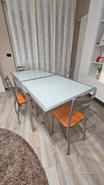 Vendo tavolo quadrato 90×90, allungabile a 180×90 in vetro e struttura in ferro, in ottimo stato ad euro 200. Inoltre vendo 4 sedie in legno e ferro ad euro 40 cadauno e 3 sgabelli dello stesso set ad euro 40 cadauno. Possibilità di acquistarli separatamente oppure tutti insieme ad euro 365.