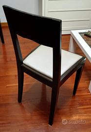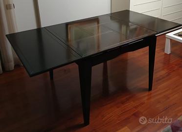 Vendo raffinato set da pranzo composto da un tavolo allungabile e quattro sedie coordinate. Il tavolo, realizzato in legno massello di ciliegio verniciato nero, misura 100x100 cm da chiuso e si estende fino a 200x100 cm quando aperto, offrendo ampio spazio per ospitare familiari e amici. Le sedie, anch'esse in ciliegio massello verniciato nero, presentano una seduta in pelle color perla, conferendo un tocco di eleganza all'insieme.