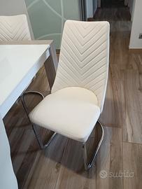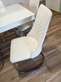 tavolo allungabile 6 sedie e 2 sedie ancora imballate la struttura è in acciaio lucido la seduta è in ecopelle il piano del tavolo è in vetro temperato bianco le parti in legno sono colore olmo