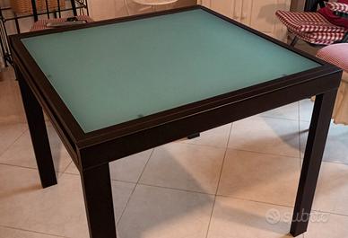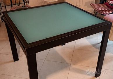Tavolo con struttura in ferro nero e vetri temperati opachi e lucidi. Dimensioni 90 x 90, aperto 180 x 90. Ottime condizioni.