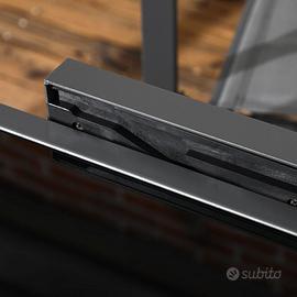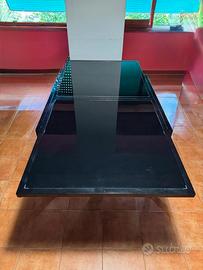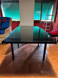 Il tavolo è stato già smontato per poterlo portare via in macchina più agevolmente. Sono state quindi rimosse le zampe e i due piani di cristallo, insieme ai paracolpi interni degli stessi. Sono presenti tutte le viti di fissaggio. La parte più ingombrante è la struttura metallica quadrata con il doppio binario, misura 90x90cm. Con le fascette sono state bloccate le parti scorrevoli per facilitare il trasporto.