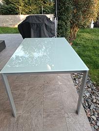 Tavolo allungabile con piano in cristallo temperato e gambe in metallo grigio chiaro. Il tavolo ha circa vent'anni e l'usura del tempo si fa vedere negli strisci presenti sulla superficie di vetro e in parte sulle gambe. È comunque un tavolo solido. L'ho cambiato solo perché non si abbina più con la cucina nuova.