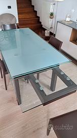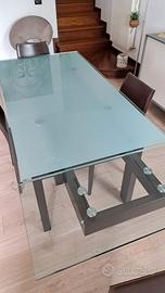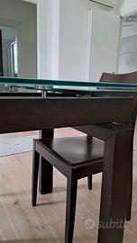 Tavolo allungabile modello HYPER di Calligaris con struttura in massello di faggio verniciato e ripiano in vetro float temperato; dimensioni da chiuso 160x85cm allungabile a 200/240x85cm. Fornito con n.4 sedie in legno scuro con seduta e schienale rivestito in pelle colore cuoio comprese nel prezzo