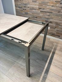 Tavolo Arredo3 modello Mio, altezza 76cm, larghezza 80cm, lunghezza da chiuso 140cm, allungabile a 200cm. L’allunga e’ alloggiata sotto come da foto. Piano in laminato color cemento chiaro. Condizioni perfette. Per eventuale spedizione, necessario prendere accordi preventivi.