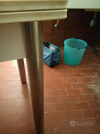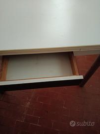 Tavolo rettangolare allungabile con prolunghe sui 2 lati corti. Presenta superficie lavabile in formica bianca, gambe in metallo scuro, un cassettino. Misure chiuso cm 110 per 66, aperto lunghezza 170. Ritiro presso Sulzano BS