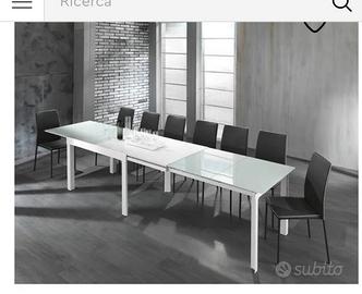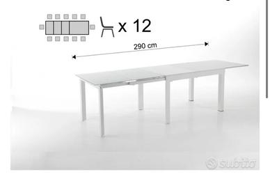 Tavolo Tomasucci 120cmx83cm altezza 75 cm, allungabile sino a 350 cm. Gambe in metallo verniciate bianco opaco e piano di vetro temprato 8 mm verniciato bianco. Due prolunghe in vetro e due in MDF. Ottimo stato