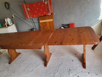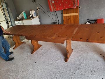 tavolo rustico in legno massello, allungabile con relative prolunghe, il tavolo da chiuso misura 1,80cm invece con le prolunghe arriva a 3,70 ,a piacere le prolunghe si aggiungono in base alle esigenze, 16 posti totali, considerato che ha qualche segno di usura il prezzo è trattabile