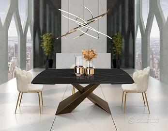 tavolo allungabile con base in metallo colore bronzo, piano opaco arrotondato in ceramica