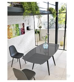 Tavolo allungabile con top in ceramica (5 mm) su vetro temperato (8 mm). Allugnhe in ceramica su vetro Gambe in metallo verniciato. Ritiro da parte dell’acquirente